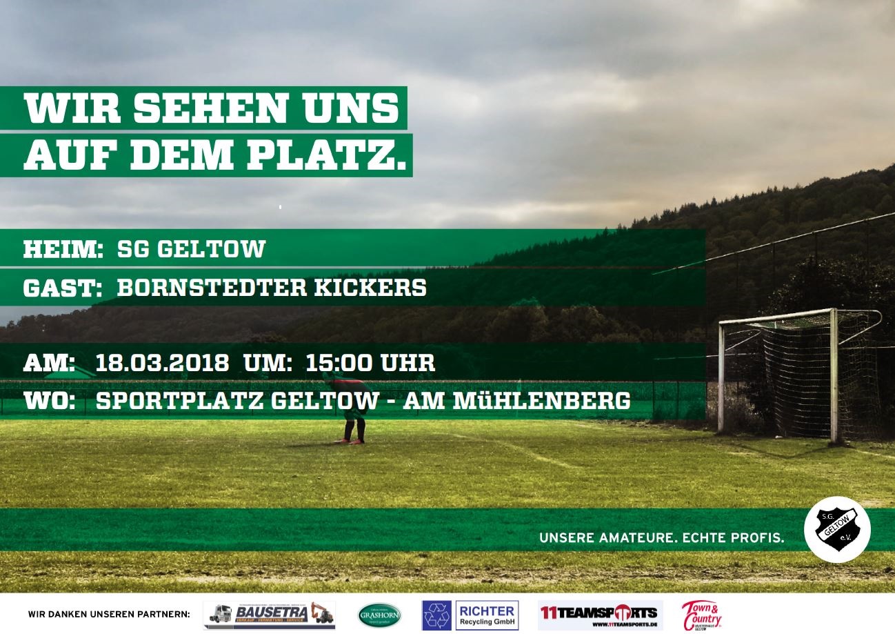 So, 18.03.18 | 15:00 Herren | 2.Kreisklasse SG GELTOW : BORNSTEDTER KICKERS Spielstätte:Sportplatz Geltow Am Mühlenberg | Am Wasser 3 | 14548 Schwielowsee